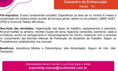 outubro 24, 2022Vagas da semana para hotelaria Offshore, só enviar o currículo, em anexo, em PDF, colocar uma...